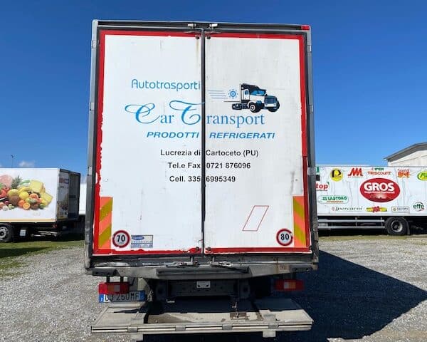 Allestimento frigorifero monotemperatura con gruppo frigo Carrier Supra 950, cassa con misure interne utili: L 8.760 x l 2.450 x h 2.590 con sponda retrattile Elefantcar di portata 2.000Kg.